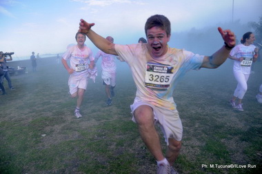 Fucsia, verde, azul y amarillo fueron los colores usados para pintar a los corredores con este talco que volaba por el aire generando un clima de alegria en la remeras blancas de los participantes.
