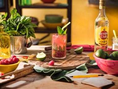 Agregar en vaso de trago largo el azúcar y el jugo de lima hasta tapar el azúcar, agregar las frambuesas y machacar con un mortero, hasta formar una pasta. Agregar las hojas de menta y presionar suavemente sin romper las hojas., llenar de hielo partido; agregar el ron y remover para mezclar bien. Completar con más hielo si es necesario. Terminar de llenar con la soda volver a remover suavemente.