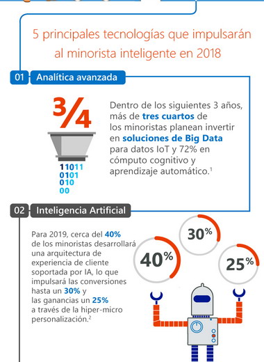 1. Analítica avanzada: Dentro de los próximos tres años, más de tres cuartos de los minoristas piensan invertir en soluciones de Big Data para datos IoT y el 72% en servicios cognitivos y aprendizaje automático1.