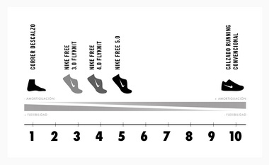 Si se ubica al calzado para correr en una escala del 1 al 10, donde 1 representa el correr descalzo y 10 hacerlo con un calzado convencional, las Nike Free 3.0 Flyknit ofrecen la mayor flexibilidad y un andar más cercano al suelo. Las Nike Free 4.0 Flyknit proporcionan más amortiguación que las 3.0 para los corredores que lo requieran y una sensación más natural que las 5.0. Por último, las Nike Free 5.0 brindan los beneficios de un movimiento natural a aquellos que buscan un andar más tradicional.