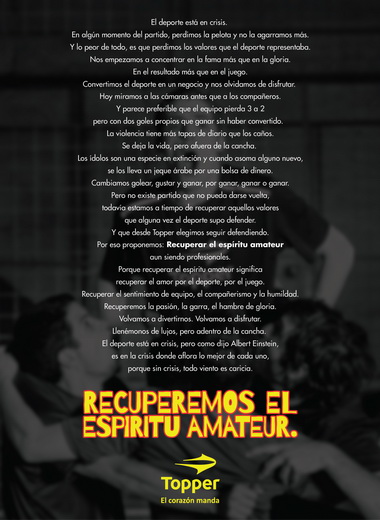 De esta manera, Topper expone su punto de vista sobre la actualidad deportiva e invita a recuperar el ESPÍRITU AMATEUR volviendo a jugar con el corazón, a través del respeto, la humildad, el espíritu de equipo, la garra y la pasión.