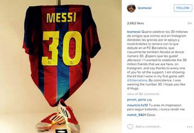 Junto con la imagen, escribió: “Quería celebrar los 30 millones de amigos que somos acá en Instagram dándoles las gracias por el apoyo y mostrándoles la remera con la que debuté en el FC Barcelona <https://www.instagram.com/fcbarcelona/>, que casualmente también llevaba el dorsal número 30. ¡Espero que les guste! ¡Abrazos!”