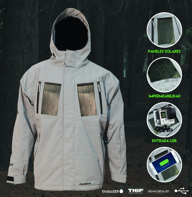Esta  novedosa campera utiliza la energía solar para realizar la carga de cualquier dispositivo móvil y lo hace por medio de paneles solares. Éstos  son impermeables y totalmente flexibles lo cual no se rompen ante los posibles golpes.